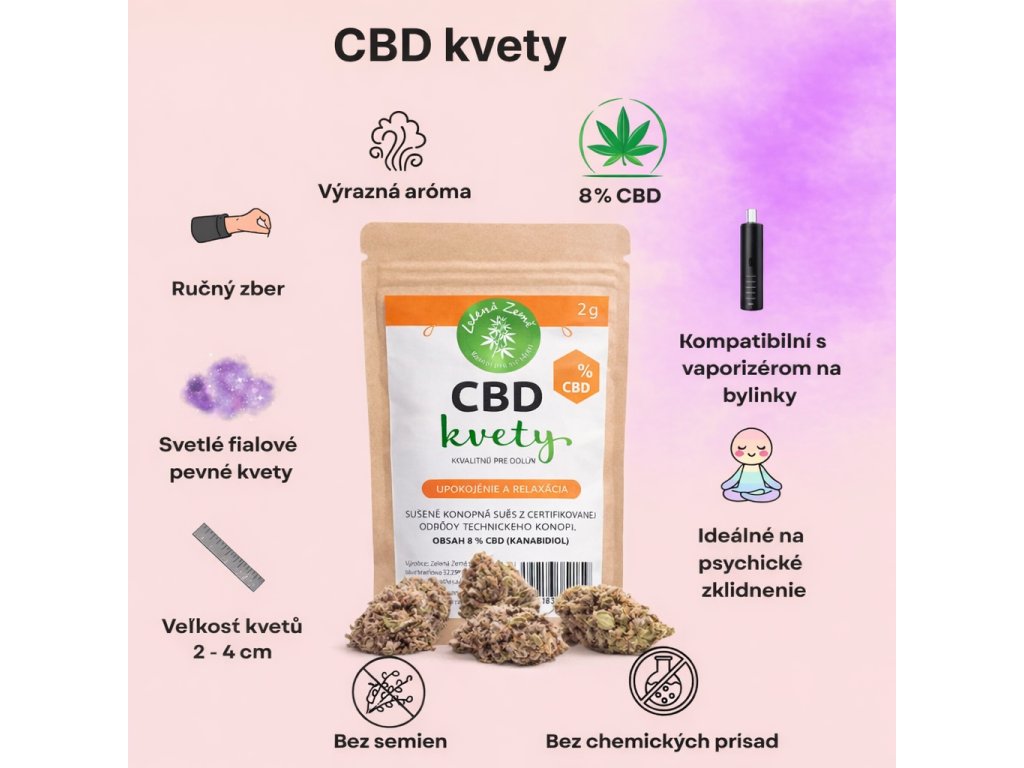 CBD kvety s 8 % obsahom CBD vypestované a ručne zozbierané. Starostlivé spracovanie a šetrné sušenie „na vzduchu“ pomáha zachovať prirodzenú arómu aj vzhľad kvetov. Ideálna voľba pre chvíle, keď chcete spomaliť a dopriať si uvoľnenie a relaxáciu.